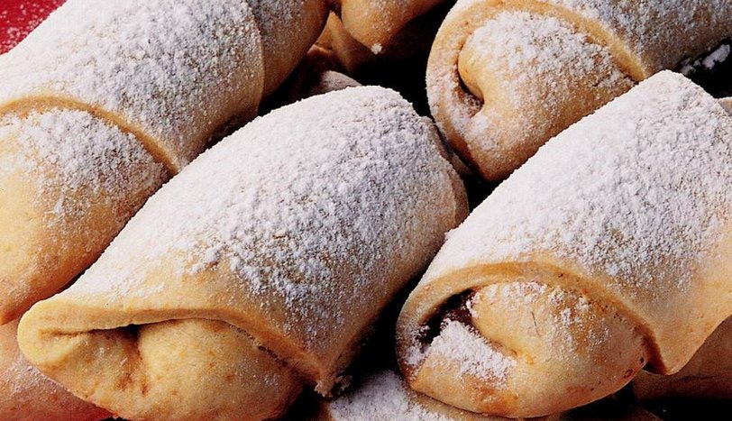 Her bezeyi merdaneyle 2-3 mm kalınlığında açın. Bıçakla 8 üçgen kesin. Hazırladığınız harcı, üçgen şeklinde kestiğiniz hamurların bir köşesine koyun. Sigara böreği sarar gibi sarın. 150 derece fırında, üzerileri kızarana dek pişirin. Pudra şekeri serpip servis yapın.