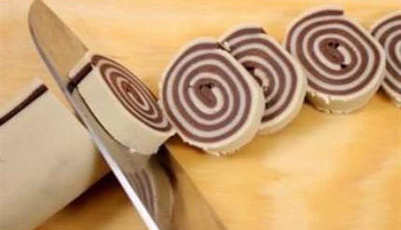 Beyaz hamurun üzerine yumurta akı sürüp kakaolu hamuru üstüne getirin onunda üzerine yumurta akı sürüp rulo haline getirin. Streçleyip tekrar 1 saat dolapta bekletin. Keskin bir bıçakla 1 cm kalınlığında dilimleyin.fırın tepsisine yağlı kağıt serip üzerine kurabiyeleri yerleştirin. Yaklaşık 15/18 dak 180° pişirin.