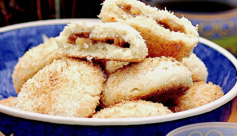 Hamurdan yumurta büyüklüğünde parçalar koparıp, elinizde yuvarlayın. İçli köfte gibi içini açın. Marmelat ve ceviz karışımından alarak hamurların içine yerleştirin. Ağzını kapatıp yumurta akına bulayın. Ardından hindistan cevizine bulayarak, unlanmış fırın tepsisine dizin. Orta ısılı fırında hafifçe pembeleştirin. Soğuk olarak servis yapın.