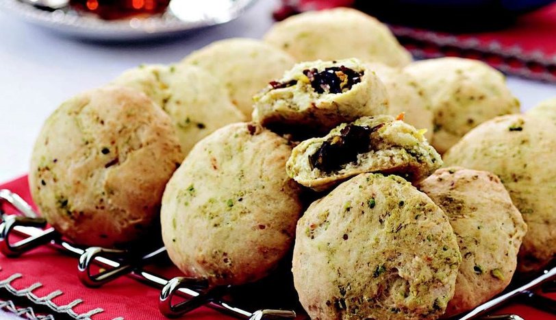 Harç için hurma, file antep fıstığı ve portakal kabuğunu harmanlayın. Hamurdan ceviz iriliğinde bezeler koparın. Ortalarına harçtan pay edip, elinizde yuvarlayın. Önceden ısıtılmış 170 derece fırında pembeleşene dek pişirin.