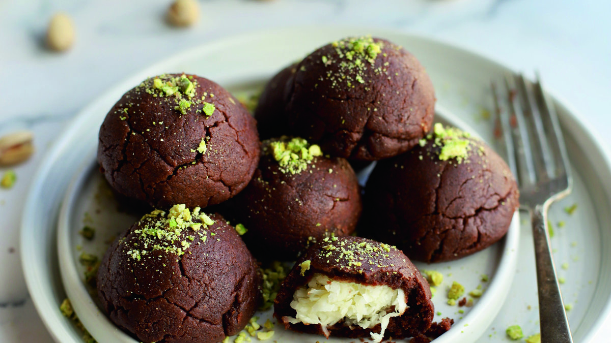Dolgu için Hindistan cevizi, çiğ krema ve pudra şekerini iyice karıştırın. Buzdolabına yerleştirip 10-15 dakika dinlendirin. Sürenin sonunda dolgudan ceviz büyüklüğünde parçalar koparıp hafifçe elinizde yuvarlayın ve yeniden buzdolabına yerleştirin.
