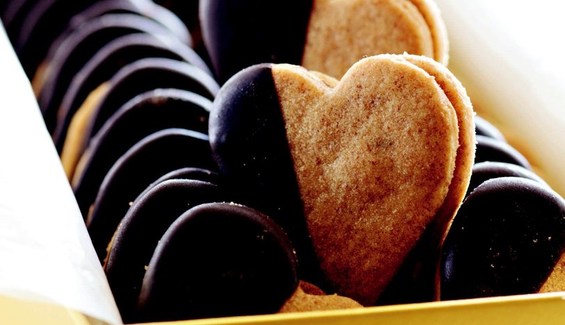 Daha sonra küçük kalp kurabiye kalıpları ile kesin. Yağlı kağıt serilmiş fırın tepsisine yerleştirin. Önceden ısıtılmış 150 derece fırında 15-20 dakika pişirin. Soğuduktan sonra yarısının üzerine karamel sosu sıkın.