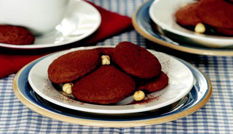 Bir saat buzdolabında beklettikten sonra merdane yardımı ile açın. Açtığınız hamurdan bardak ağzı ile parçalar kesin. Yağlı kağıt serdiğiniz fırın tepsisine kurabiyeleri dizip, önceden ısıtılmış 150 derecelik fırında 10 dakika pişirin. Servis tabağına alıp üzerilerine kakao serpin. Fındıkla süsleyip servis yapın.