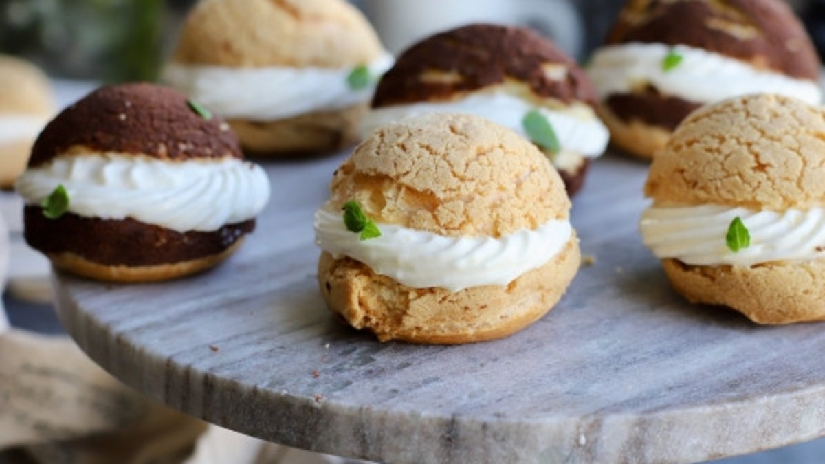 Soğuyunca labne peyniri ve krem şanti ilave edip iyice çırpın. Fırından alınıp iyice soğuyan 1 adet pufun düz kısmına sıkma torbası yardımıyla kremadan sıkın.
