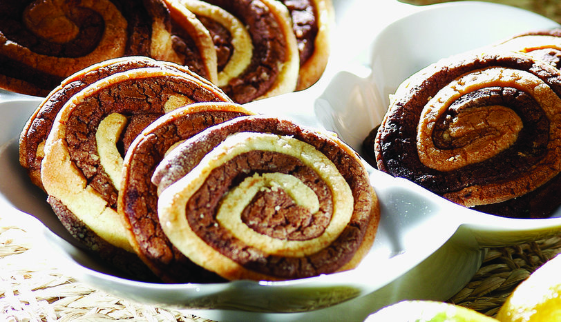 Hamurlardan birine rendelenmiş limon kabuğunu ekleyip tekrar yoğurun. Diğer yarısına erimiş çikolatayı ekleyip karıştırın. Unlanmış zemin üzerinde her iki hamuru da dikdörtgen şeklinde açın.