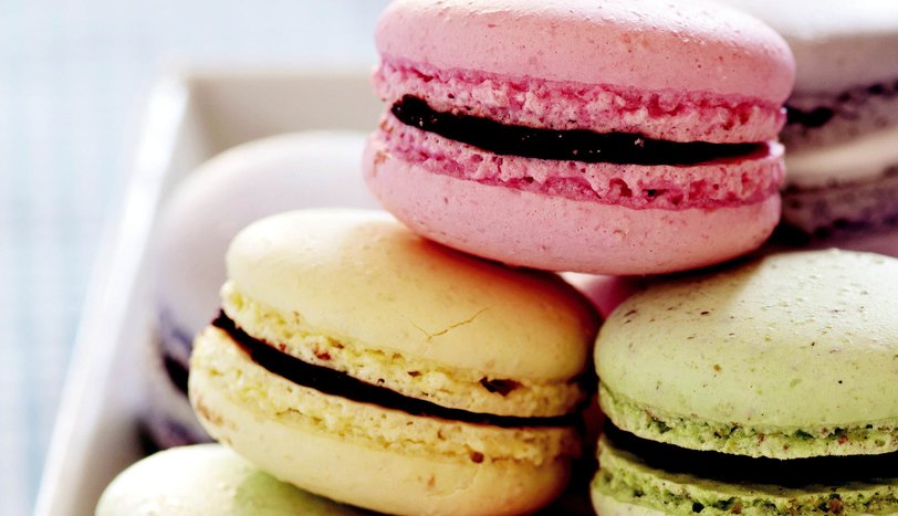 Önceden ısıtılmış 180 derece fırında 10-12 dakika pişirin. Ara dolgusu için kremayı ısıtın ve parçalara ayırdığınız çikolatayı içine katıp, karıştırın. Ilınmış iki adet renkli makaronun arasına ılınmış çikolatalı karışımdan koyup, yapıştırın. Diğer makaronları da aynı şekilde hazırlayın.