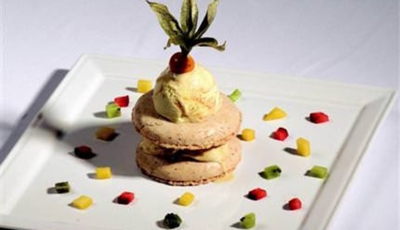 Karışımı sıkma torbasına alıp, yapışmaz yüzeyli fırın tepsisine 8 adet yuvarlak beze çıkarın. Önceden ısıtılmış 160 derece fırında 15-20 dakika pişirip, soğumaya bırakın. Macaronları servis tabağına üst üste koyun. Üzerine dondurmayı yerleştirin. Meyve parçaları ve nane yaprağıyla süsleyerek servis yapın