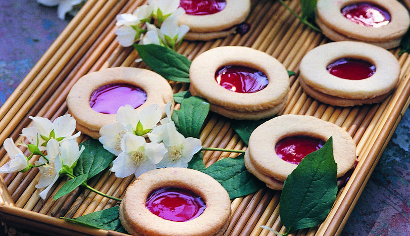 Hamurların yarısının ortasını, şişe kapağıyla çıkartın. Tüm hamurları önceden ısıtılmış 200 derece fırında pembeleşene dek 15 dakika kadar pişirin. Bisküviler ılındıktan sonra, daire şeklinde olanların üzerine marmelat sürün. Marmelat donduktan sonra üzerine ortası delik bisküvileri yerleştirip servis yapın.
