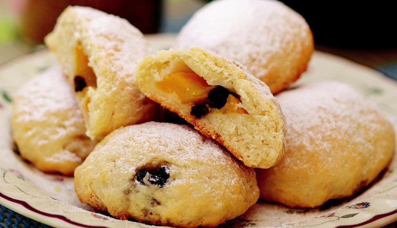 İç harcı için, şeftalilerin kabuklarını soyarak küp şeklinde doğrayın. Hamurdan ceviz büyüklüğünde parçalar koparın. Elinizde açarak içine şeftali, kıyılmış fındık ve üzümü yerleştirin. Hamuru poğaça şeklinde kapatın. Önceden ısıtılmış 180 derece fırında 30-40 dakika pişirin. Sıcak olarak servis yapın.