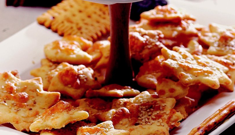 Yağlanmış fırın tepsisine bisküvileri dizin. Üzerine rendelenmiş kaşar peyniri ve susam serpin. Önceden ısıtılmış 180 derece fırında 25 dakika pişirin.