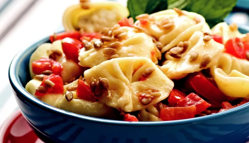 TORTELLİNİ hamuru için un, sıvıyağ, yumurta ve tuzu derin bir kapta yoğurun. Üzerini nemli bir bezle örtün ve 20 dakika dinlendirin. Unlanmış zeminde, oklava yardımıyla, ince olacak şekilde açın. Çay bardağının ağız kısmıyla yuvarlaklar kesip, çıkarın. İçi için ayçekirdeği, kıyma, kıyılmış soğan, maydanoz, tuz ve karabiberi bir kapta karıştırın. Bardakla kestiğiniz yuvarlak hamurların kenarına 1 çay kaşığı iç harçtan koyun ve diğer ucu üzerine kapatıp, yarım ay şekli verin. Daha sonra iki ucu arka tarafta birleştirin ve tortellini şekli oluşturun. Kalan hamur ve iç harç bitene kadar işleme devam edin. Kaynayan tuzlu suda tortelliniyi yumuşayana kadar haşlayın. Üzeri için tereyağını eritip, ayçekirdeğini kısık ateşte 1-2 dakika kavurun. Küp doğranmış kiraz domatesi ilave edip, 1 dakika daha kavurun. Haşlanmış tortellininin suyunu kevgir kepçe yardımıyla süzerek servis tabağına alın ve üzerine ay çekirdekli sosu gezdirip, sıcak olarak servis yapın.