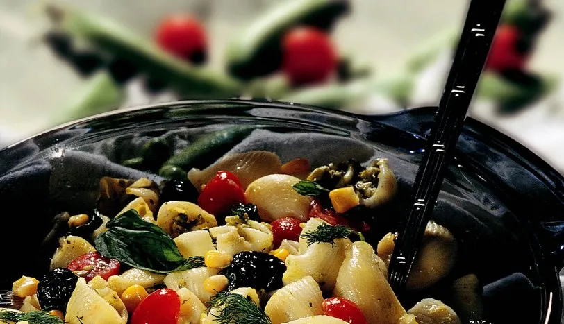 Mantı makarnayı haşlayarak süzün. Bir kapta 2 çorba kaşığı rendelenmiş kaşar peyniri, bezelye, küçükdoğranmış beyaz peynir, bir demet ince kıyılmış taze soğan, tuz ve bir tutam dereotunu karıştırın. Çatallaiyice ezin. Haşladığınız mantı makarnanın içlerini bezelyeli harçla doldurun. 2 çorba kaşığı sıvıyağdakiraz domatesleri ve zeytinleri 5 dakika soteleyin. Tüm malzemeyi derin bir kapta birleştirin. Üzerine mısır taneleri serperekservis yapın.