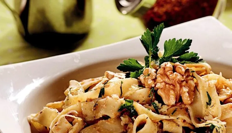 MAKARNANAYI tuzlu suda haşlayıp süzün. Tereyağını bir tavada eritip, üzerine eklediğiniz makarnayı birkaçdakika çevirip, servis tabağına alın. Ceviz, lor peyniri, sarmısak, maydanoz, fesleğen, krema ve zeytinyağını blenderden geçirip makarnaya ekleyin. Domates sos için, sıvıyağı bir tavaya alıp, üzerine rendelenmiş domates, sirke, tuz, karabiber ve kekik ilave edin. Kısık ateşte 10-15 dakika pişirin. Nişastayı suyla açıp üzerine ekleyin ve 5 dakika birlikte pişirin. Makarnaya ilave edip karıştırdıktan sonra servis yapın.