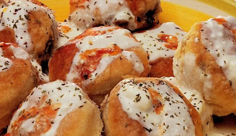BİR kabın içine kibrit kutusu kadar mayayı koyup, üzerine ılık suyu ekleyerek, eritin. Eritilmiş ve soğutulmuş margarin, tuz ve tozşeker ekleyip, karıştırın. Yavaş yavaş unu ekleyip, ele yapışmayacak kıvamda bir hamur hazırlayın. Üzerini örterek 1 saat bekletin. Bu arada iç malzemesini hazırlayın. Tavaya margarini koyup, yemeklik doğranmış soğanı hafifçe kavurun. Kıymayı ve diğer malzemeleri ekleyip, kıyma suyunu çekene kadar kavurup, soğutun. Hamuru ikiye bölün. İki hamurdan da 10'ar adet beze yapın. Oklava ile küçük pasta tabağı büyüklüğünde açın. Margarini eritip, yarısını hamurların üzerine sürün. Açtığınız 10 adet hamuru üst üste koyup, tekrar açın. Tepsiye yayın. Hazırladığınız içi yayıp, kalan 10 bezeye de aynı işlemi uygulayın. Tepsiye yerleştirip üzerine kalan margarini sürün. Son olarak bir fincanla bastırarak şekil verin ve hiç bozmadan önceden ısıtılmış 170 derece fırında pişirin. Fırından çıkarınca fincanla kesilmiş mantıları servis tabağına alın. Üzerine sarmısaklı yoğurt dökün. Maydanozla süsleyip, servis yapın.