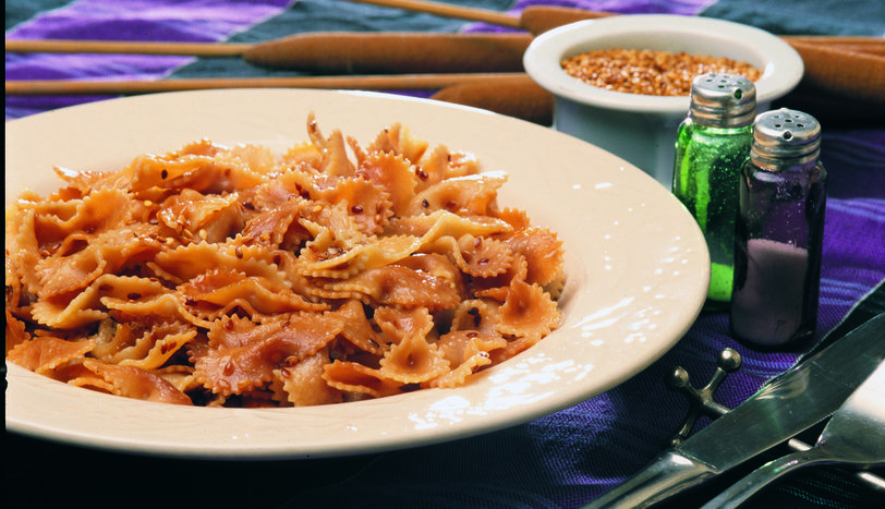Yanmaz yüzeyli bir tavaya yarım paket makarnayı koyup orta ateşte, pembeleşene kadar kavurun. Makarnalar pembeleşince tuz ve kaynar suyu ilave ederek kapağını kapatın. Kaynayınca kısık ateşte suyunu çektirerek pişirin. Diğer tarafta küçük bir tavada tereyağı ile susamı, pembeleşinceye kadar kavurun ve pişmiş olan makarnanın üzerine gezdirerek dökün ve karıştırın. Sıcak olarak servis yapın.