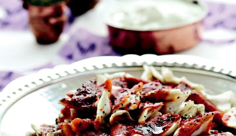 UN, yumurta ve tuzu derin bir kaba alın. Kulak memesi yumuşaklığında bir hamur elde edene kadar su ekleyip, yoğurun. Üzerini nemli bir bezle örtün ve yarım saat dinlendirin. Hamuru iki eşit parçaya ayırın. Her birini ne çok ince ne çok kalın olacak şekilde merdane yardımıyla açın. 2 parmak genişliğinde önce enine daha sonra boyuna şeritler kesip, kare parçalar elde edin. İçi için kıymayı bir kaba alın. İçine rendelenmiş soğan, kıyılmış maydanoz, tuz ve karabiber ekleyip, karıştırın. Kare hamurların içine parmağınızın ucuyla kıymalı harçtan koyun. Hamur ve iç harç bitene kadar işleme devam edin. Daha sonra hamurların iki ucunu birleştirip, üçgen olacak şekilde kapatın ve yağlanmış fırın tepsisine yerleştirin. Önceden ısıtılmış 200 derece fırında üzeri hafif pembeleşene kadar kızartın. Üzeri için tereyağını bir tavada eritin ve salçayı ilave edip, hafif çevirin. Su ekleyip, salçayı açtıktan sonra tuz, karabiber ile pulbiber katın. 2 dakika kaynatın ve fırından çıkardığınız mantının üzerine gezdirin. Yoğurt ve dövülmüş sarmısağı bir kapta karıştırıp, sıcak mantı ile birlikte servis yapın.