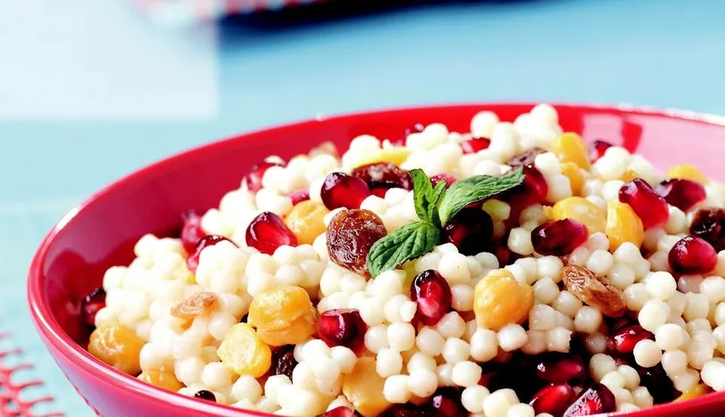 KUSKUSU haşlayın ve süzün. Nohut ve kuruüzümü tencereye alın. Tereyağını ilave edip, karıştırarak eritin. Kuskusu koyup, tuzunu ayarlayın. Tüm malzemeyi şöyle bir çevirdikten sonra tencereyi ocaktan alın. Nar tanelerini ilave edin ve sıcak olarak servis yapın.