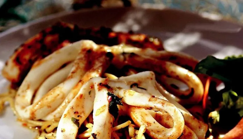 NOODLE'Yİ haşlayıp suyunu süzün. 2 çorba kaşığı zeytinyağı ve sarmısakla birlikte 1-2 dakika çevirin. Kekik, nane, tuz ve pulbiber serpin. Diğer taraftan süt, tozşeker ve tuzu bir kasede karıştırın. Kalamarları bu sosun içinde buzdolabında 1 gece bekletin. Sostan alıp zeytinyağı, kekik ve pulbiber karışımında 1 saat bekletin. Daha sonra ızgara yapın. Haşlanmış noodle ile birlikte sıcak olarak servis yapın.
