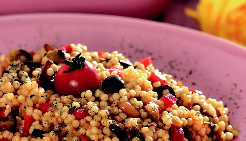 Kuskusu 1 tatlı kaşığı safran katılmış bol suda 10 dakika haşlayın. Suyunu süzdükten sonra servis tabağına alın. Alacalı soyulmuş patlıcanları küp şeklinde doğrayıp kızgın sıvıyağda kızartın. Yağının süzülmesi için kağıt havlu üzerine alın. İnce kıyılmış soğanı ve dolmalık fıstığı 2 çorba kaşığı zeytinyağında 1-2 dakika kavurun. Patlıcan, soğanlı karışım, kalan zeytinyağı, soya sosu, limon suyu, sarmısak, kakuleyi kuskusa katın. En son zar şeklinde doğranmış kırmızı biber, tuz, karabiber ve pulbiberi ilave ederek bütün malzemeyiiyice karıştırın. Sıcak olarak servis yapın.