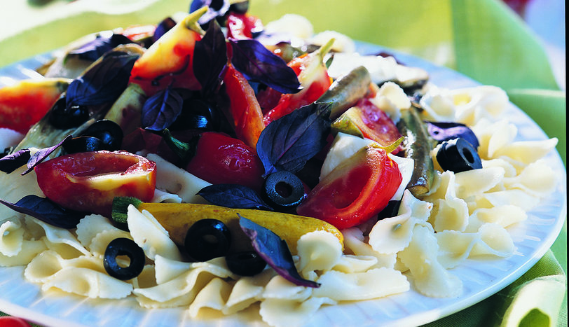 kaynayan yağlı ve tuzlu suda haşlayıp, süzgeçten geçirin. Sebzeleri irice doğrayın. Zeytinlerle birlikte sıvıyağda sürekli karıştırarak soteleyin. Sebzeleri de makarnaya ilave edin. Üzerine mozarella ve reyhan ekleyip servis yapın.