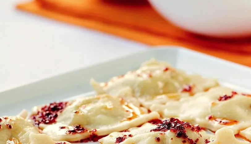 UNUN ortasını açıp, 4 adet yumurta sarısı ve 3 adet yumurtanın akı, sıvıyağ ve tuz ekleyin. Azar azar su ilavesiyle yoğurup sert bir hamur elde edin. 30 dakika dinlendirip, 1 mm kalınlığında açın. Harç için patlıcanları közleyip, kıyın. Peynir, karabiber ve tuz ekleyip karıştırın. Açtığınız hamurun yarısına aralıklarla harç yerleştirip, diğer yarısını üzerine kapatın. Kare veya yuvarlak şekilde kesip, zeytinyağı eklenmiş kaynar tuzlu suda haşlayın. Suyunu süzüp servis tabağına alın. Üzerine tereyağında kızdırılmış pulbiber gezdirip servis yapın.AŞÇININ NOTURavioliyi yuvarlak, kare ve üçgen olmak üzere farklı şekillerde hazırlayabilir, ayrıca raviolinin iç harcını ağız tadınıza göre peynirli, mantarlı, ıspanaklı, patlıcanlı ve tavuklu olmak üzere çeşitli şekillerde yapabilirsiniz.