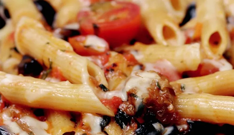 Penneleri hafif diri kalacak şekilde (al dante) haşlayın. Alacalı soyulmuş patlıcanları küp şeklinde doğrayıp,tuzlu suda bekletin. Süzgeçten geçirip, sıvıyağda kızartın. Tencereye 1 çorba kaşığı zeytinyağını alıp kızdırın.Domates püresini ekleyip soteleyin. Siyah zeytini patlıcana ekleyin. Hepsini birlikte makarnaya ilave edin. Servisten önce parmesan peyniri serpip, kiraz domateslerle süsleyin.AŞÇININ NOTUAl dante pişirme: Nispeten az pişirilmiş, yenecek kadar yumuşak, ancak dağılmayacak kadar sert, dişe gelir kıvamda pişirme. Makarnanın dışının yumuşak, içininse hafif sert kalacak şekilde pişirilmesi.
