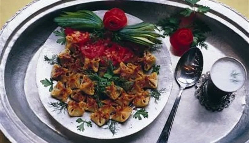 Kıymayı tereyağı ile 15 dakika suyunu çekene dek kavurun. Unu bir kaba eleyin. Süt, yumurta ve tuz ilave ederek orta sertlikte bir hamur yoğurup, 10 dakika dinlendirin. Bu arada, soğanı ince ince kıyın. Tereyağı ile pembeleştirin. Üzerine pirinci ilave ederek 4-5 dakika kavurun. Kavrulmuş kıyma ve sıcak su ekleyerek pişirin. Karabiber, tuz ve ince kıyılmış maydanozu ekleyerek karıştırın. Hamuru 2 mm kalınlığında açın. 5 cm'lik kareler kesin. Hazırlamış olduğunuz içi, karelerin üzerine koyup, bohça şeklinde kapatın. Kapatılan hamurları tereyağı ile yağlanmış bir tepsiye yerleştirin. Hafif ısılı fırında, alt kısımları pembeleşinceye dek kızartın. 5 su bardağı kaynar suya etsuyu tabletini atın. Az tuz ilave ederek karıştırın. Sıcak olarak mantıların üzerine dökün. Önce harlı, daha sonra kısık ateşte suyunu çekene dek pişirin. Servis tabağına alıp, domates, nane ve dereotuyla süsleyin. Üzerine tereyağında kızdırılmış kırmızıbiber gezdirip, ayranla birlikte servis yapın.