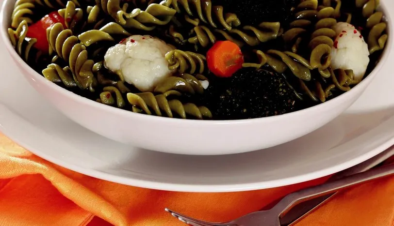 RENKLİ makarnayı tuzlu suda haşlayıp süzdükten sonra derin bir kaseye alın. Sebzelerin her birini ayrı ayrı yumuşayana kadar haşlayın ve süzün. Havucu doğrayıp diğer malzemelerle birlikte makarnaya ilave edin. Diğer tarafta sos için, zeytinyağı, ince kıyılmış sarmısak, tuz ve pulbiberi karıştırın. Hazırladığınız sosu makarnaya gezdirin. İster ılık ister soğuk servis yapın.