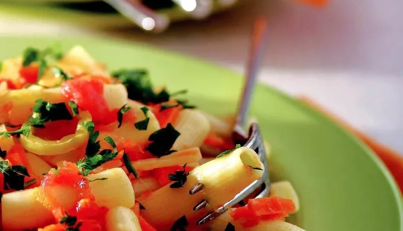 MAKARNAYI, yarım çorba kaşığı sıvıyağ ve tuz ilave ettiğiniz suda, tencerenin ağzı açık olarak suyunu çekene kadar pişirin. Diğer taraftan 2 çorba kaşığı sıvıyağda ince kıyılmış soğan ve sivri biberi soteleyin. Rendelenmiş havuç ve domatesi ilave edip sotelemeye devam edin. Pişen makarnanın üzerine hazırladığınız sosu dökün. Bütün malzemeyi bir kere karıştırdıktan sonra, ince kıyılmış maydanozu ilave edin. Tencerenin ağzını kapatıp 5 dakika dinlendirin. Sıcak olarak servis yapın.