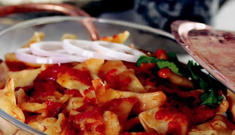 Unu derin bir kaba alın, ortasını havuz şeklinde açıp 1 adet yumurta ile diğer yumurta sarısını, tuz ve su ilave edip kulak memesi yumuşaklığında bir hamur elde edene kadar yoğurun. Üzerine nemli bir bez örtüp 15 dakika dinlendirin. Hamuru 4 parçaya ayırıp her birini açın. Hamurları enlemesine ve boylamasına şeritler halinde keserek küçük kareler elde edin. Ortalarına 1'er çay kaşığı tulum peyniri koyup kenarlarına yumurta akı sürüp üçgen olacak şekilde kapatın. Sıvıyağda hafif pembeleşene kadar kızartıp servis tabağınaalın.Diğer taraftan tereyağında yemeklik doğranmış soğanları hafif kavurun. Domates ve biber salçası, et suyu veya su koyup 5 dakika pişirerek sos hazırlayın. Mantıların üzerine bu sosu gezdirip ince kıyılmış maydanozla süsleyerek servis yapın.