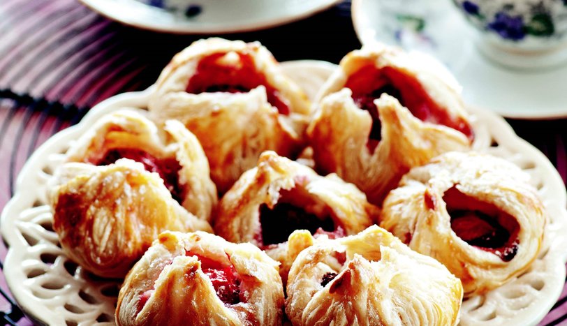 Ayrı bir yerde milföy hamurlarını oda sıcaklığında yumuşatın. Her bir milföyü dört eşit parçaya bölüp, 20 parça milföy elde edin. Bir parça milföyün üzerine 1 çay kaşığı krema sürüp, 1 adet çilek yerleştirin.
