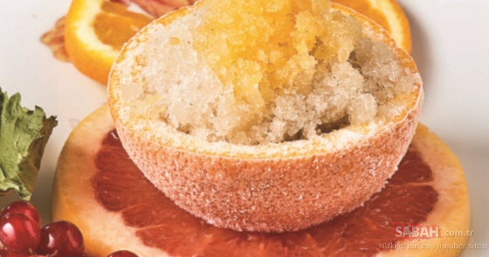 Dilimlenmiş greyfurtları servis tabağına alın. Üzerlerine portakal kaselerini oturtun. Sorbeleri ayrı ayrı blenderden geçirin.