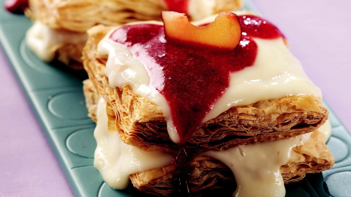 Soğuk kremayı sıkma torbasına alıp, yarısını milföylerin üzerine sıkın. Kalan milföyleri de üzerine kapatıp, yeniden krema sıkın. Erik sos gezdirip servis yapın.