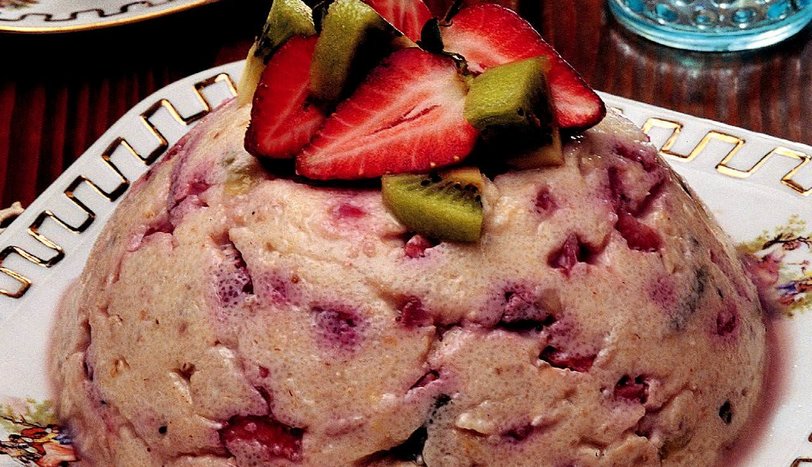 Ilınan tatlıya rendelenmiş hindistan cevizini ve meyveleri ilave edip karıştırın. Karışımı su ile ıslatılmış bir kaseye boşaltın. Bir gece buzdolabında bekletin. Servis tabağına ters çevirip, dilimleyerek servis yapın.AŞÇININ NOTUAşçının notu: Bu tatlıda vişne, kiraz, ahududu, böğürtlen gibi meyveler de kullanabilirsiniz.