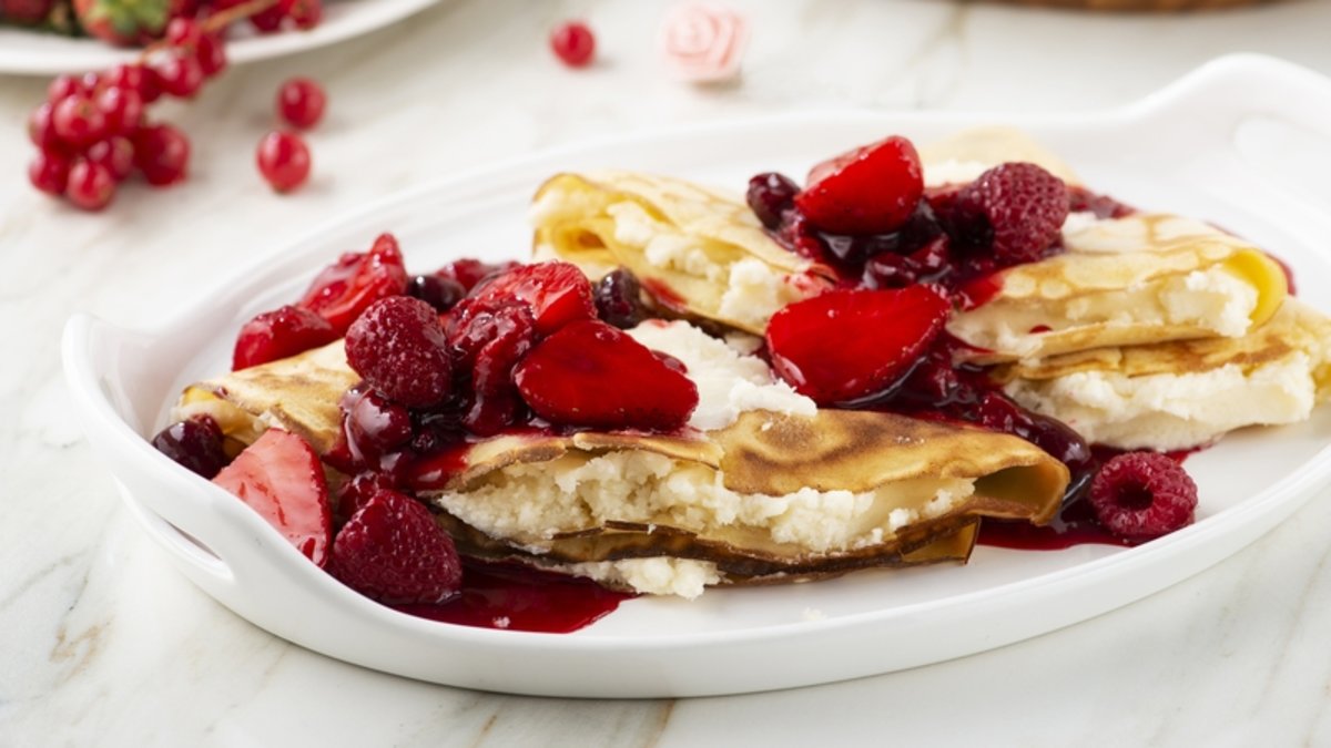 Krepleri dilediğiniz şekilde katlayıp aralarına kremayı pay edin. Üzerine kalan kremadan yerleştirin. Meyveli karışımı gezdirip servis yapın.