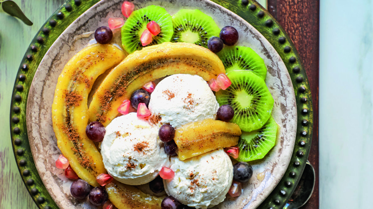 Kiviyi dilimleyin. Kiviyi ve dondurmayı servis tabağına koyun. Ilık muzları nazikçe tavadan alıp servis tabağına yerleştirin. Nar ve üzümleri serpiştirin Bir kaşıkla tavada kalan sosu meyvelerin üzerinde gezdirin. Tarçın döküp servis yapın.