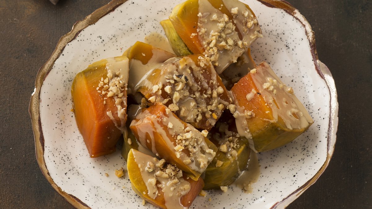 Kabak tatlısının en iyi eşlikçilerinden biri tahindir. Pişen kabak tatlısının üzerine tahin dökerek ve ceviz serperek servis etmek tadını katlayacaktır.