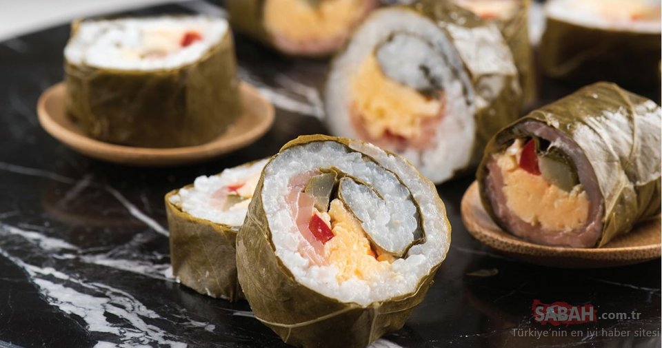 Hazırladığınız pirinci asma yapraklarının tamamını kaplayacak ve ince bir tabaka olacak şekilde üzerine yayın. Ortasında uzunlamasına somon fümenin, çırpılmış yumurtanın, kornişon ve kırmızı biberleri yarısını koyarak sıkı bir şekilde sarın. Kenarlarındaki fazlalıkları kesip düzgün bir silindir oluşturun ve streç filme sararak buzdolabına kaldırın.