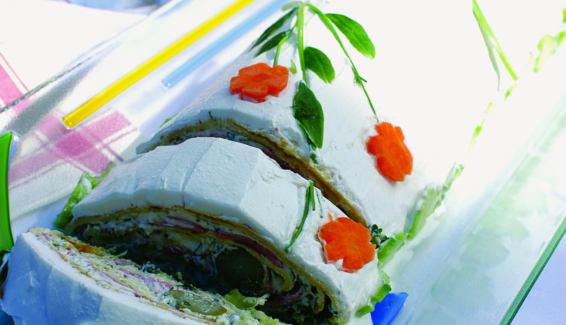 Buzdolabında en az 6 saat sertleşmesi için bekletin. Daha sonra krebi dolaptan alıp, paketini açın. Keskin bir bıçakla iki ucunu da düzleştirin. Labne peyniri ve yoğurdu karıştırıp, rulonun üzerine spatül yardımıyla sürün. Çiçek şekli verilmiş havuç ve maydanoz yaprakları ile süsleyin.