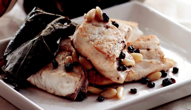 Asma, defne, limon ve turunç yapraklarını yıkayın. Balığın filetosunu çıkarın. Üzerine tuz serpip, zeytinyağında önlü arkalı kızartın.
