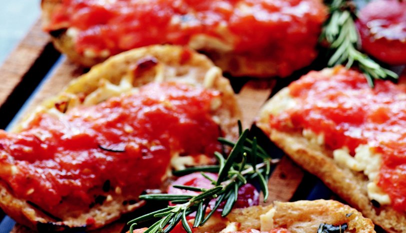 Rendelenmiş domates koyun. Kalan zeytinyağlı karışımı ekmeklerin üzerlerine gezdirin. Önceden ısıtılmış 180 derece fırında kızarana dek pişirin.