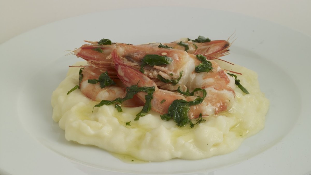 Servis tabaklarına karnabahar püresini paylaştırın. Üzerlerine jumbo karidesleri yerleştirin.