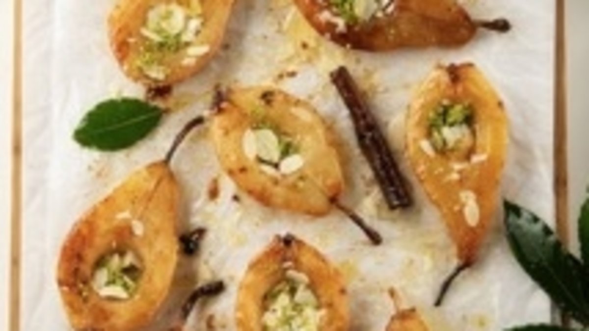 Önceden ısıtılmış 180 derece fırında 15-20 dakika aralıklarla ters yüz çevirerek yaklaşık 50 dakika pişirin. Fırından çıkan armutların üzerine Antep fıstığı ve badem serpin. Bal gezdirip servis yapın.