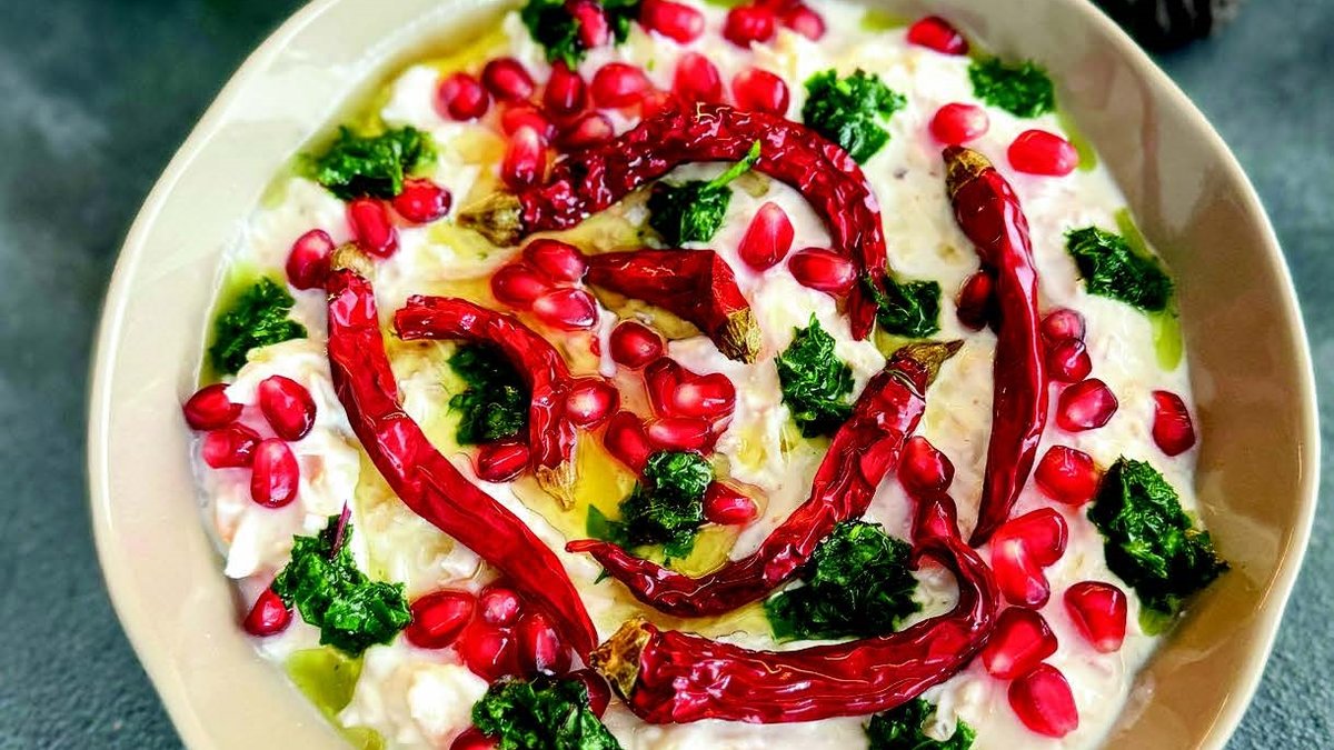 Hazırladığınız biberli yağı yoğurtlu karışımın üzerine gezdirin. Nar taneleri ve kıyılmış yeşilliklerle süsleyerek servis yapın.