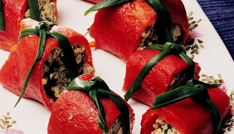 Hazırladığınız bu harcı közlenmiş kırmızı biberlerin içine pay ederek doldurun. Biberleri 2 parmak kalınlığında dilimleyin. Taze soğanı önce kaynayan suya, sonra soğuk suya atıp suyunu süzdürün. Biberleri taze soğan saplarıyla fiyonk şeklinde bağlayıp, servis yapın. - 2