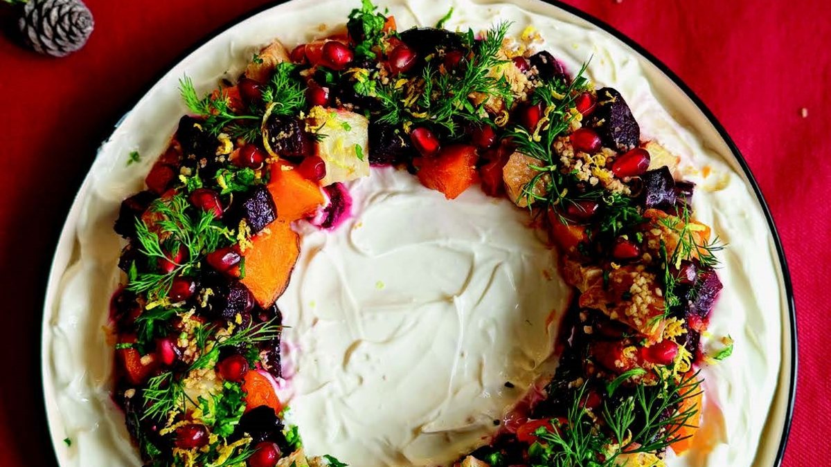 Süzme yoğurdu bir kaba alın. Sarımsakları rendeleyin ve yoğurdun içine ekleyip çırpın. Yoğurdu servis tabağına yayın. Üzerine pişen sıcak sebzeleri yayın. Ceviz, kıyılmış maydanoz ve narla süsleyip servis yapın.