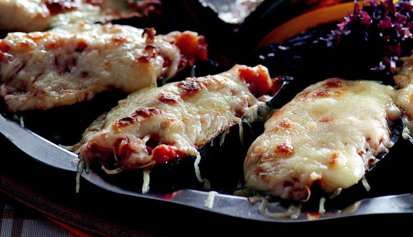 Midyelerin kabuklarını açıp, fırın tepsisine yerleştirin. Ayrı bir yerde kıyılmış soğan ve sarımsağı ayçiçek yağında soteleyin. Rendelenmiş domates ve fesleğen ilave edip, 10 dakika pişirin.