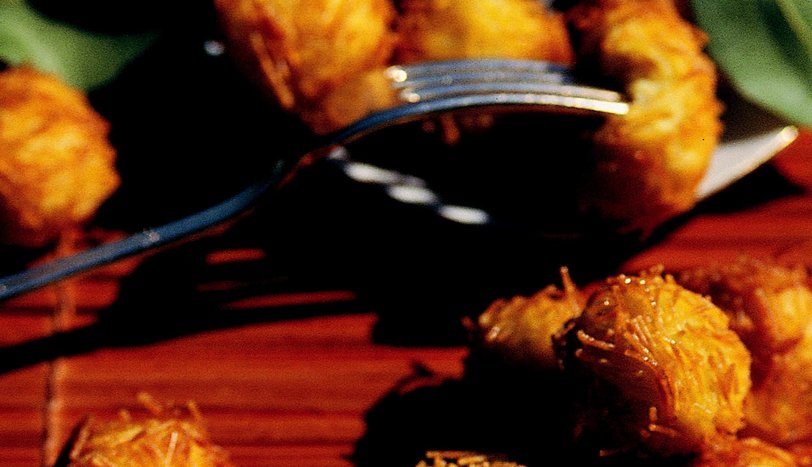 Hamurdan ceviz büyüklüğünde parçalar koparıp toplar hazırlayın (bunun için, ara sıra suya batırılan iki tatlı kaşığından yararlanabilirsiniz). Topları, tepsiye yaydığınız ufalanmış tel şehriyelere bulayın. Derin bir tencerede yağı kızdırıp içine topları atın. Altın sarısı rengini alana dek kızartın. Sıcak olarak servis yapın.