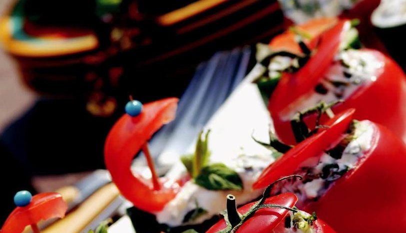Domates içi, kaşar peyniri, labne peyniri, nane, karabiber ve tuzu karıştırın. Bu karışımı krema torbasına doldurun. Domates ve salatalıkların içine sıkın. Nane yaprakları ile süsleyerek servis yapın.