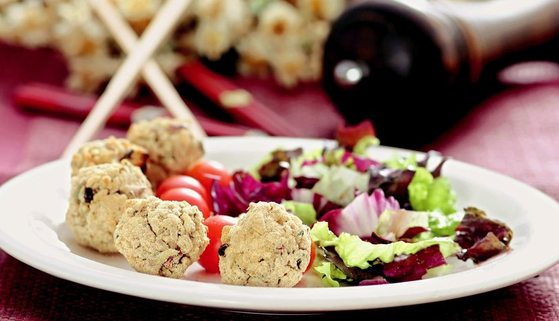 Bu karışımdan ceviz büyüklüğünde parçalar koparın. Avucunuzun içinde yuvarlayarak toplar hazırlayın. Hazırladığınız topları galeta ununa bulayarak önceden ısıtılmış 170 derecelik fırında üzerileri kızarana dek pişirin. Daha sonra kiraz domates ve Akdeniz yeşilliği ile süsleyerek servis yapın. - 2